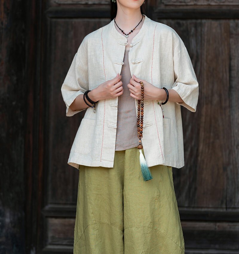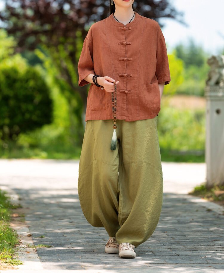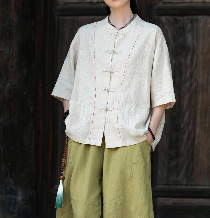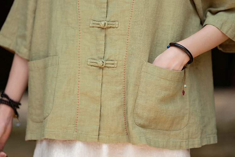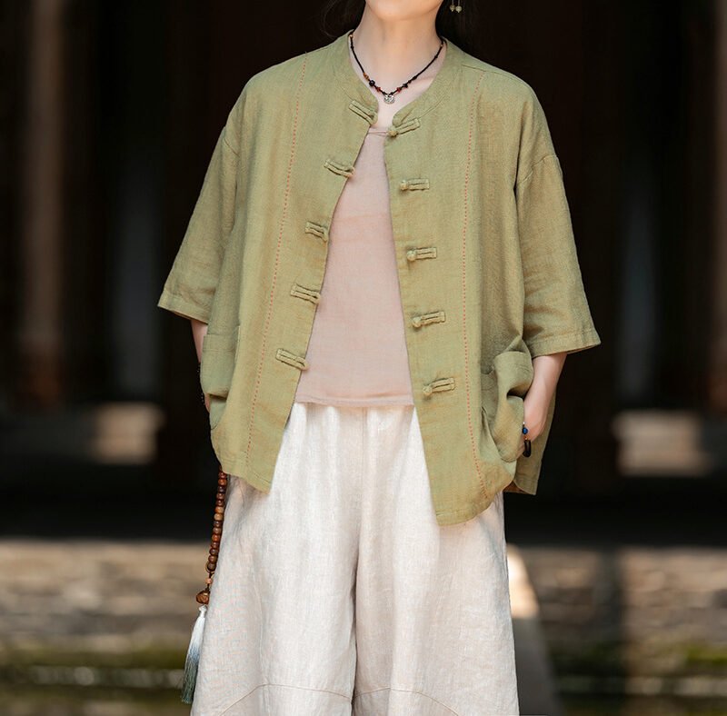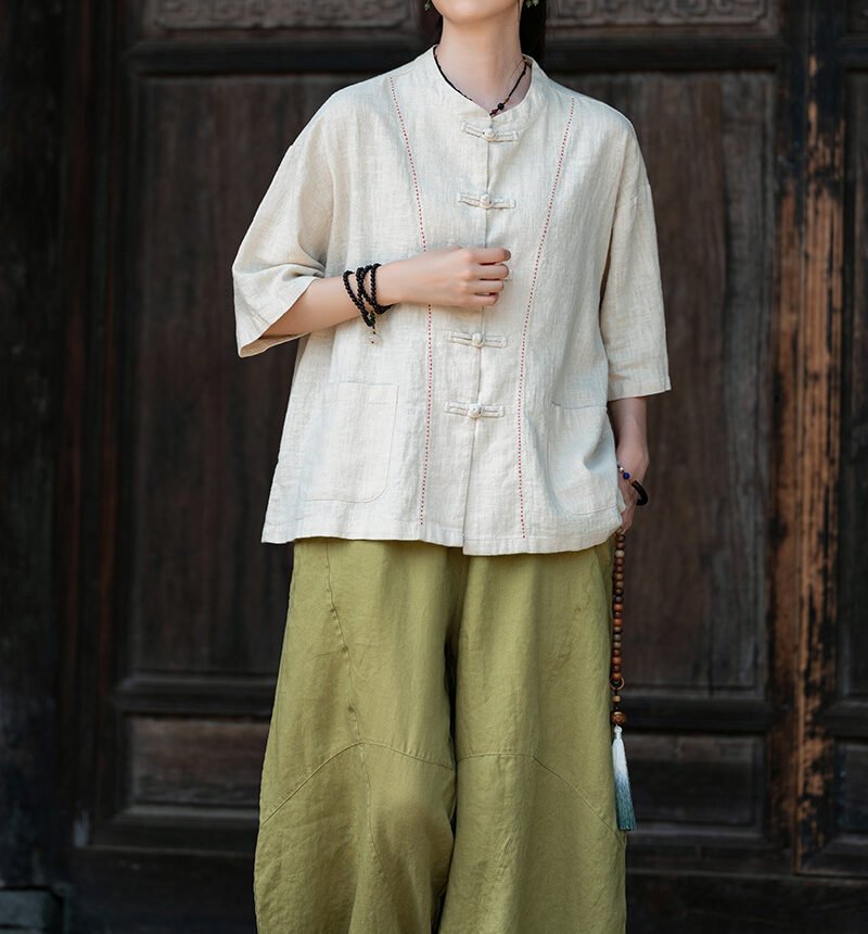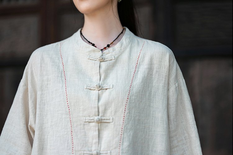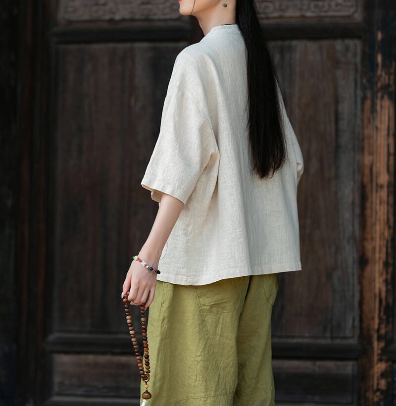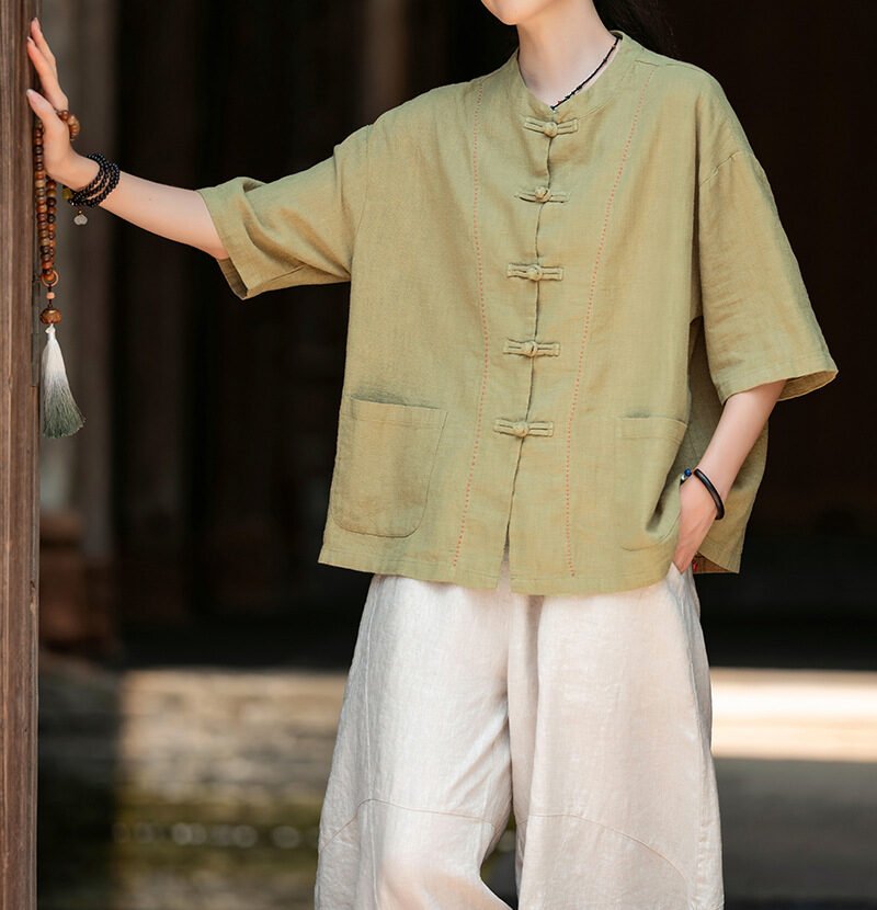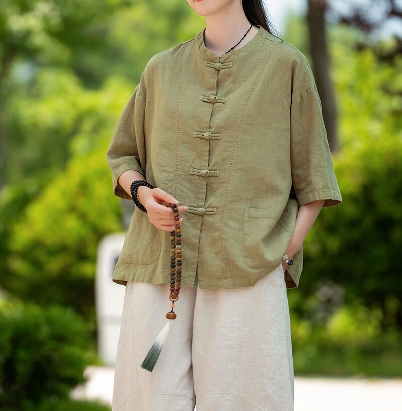 Cotton and linen women’s handmade sewn button-up top